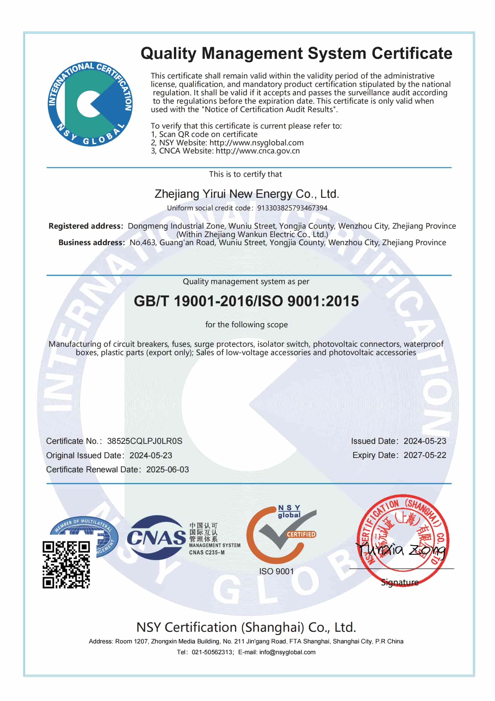 I dagens mycket konkurrenskraftiga och ansvarsfulla globala marknad är certifiering viktigare än någonsin. Genom att erhålla ISO 9001 och ISO 14001 har YRO ytterligare etablerat sin position som tillverkare inom solenergi och elektriska industrier.